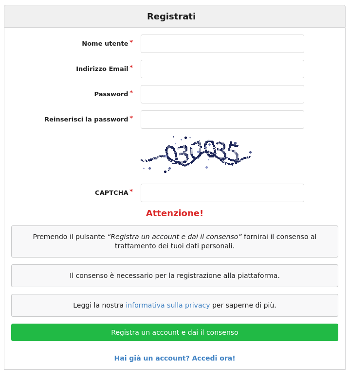 Attenzione! Premendo il pulsante 'Registra un account' fornirai il consenso al trattamento dei tuoi dati personali. Il consenso è necessario per la registrazione alla piattaforma. Leggi la nostra informativa sulla privacy per saperne di più.